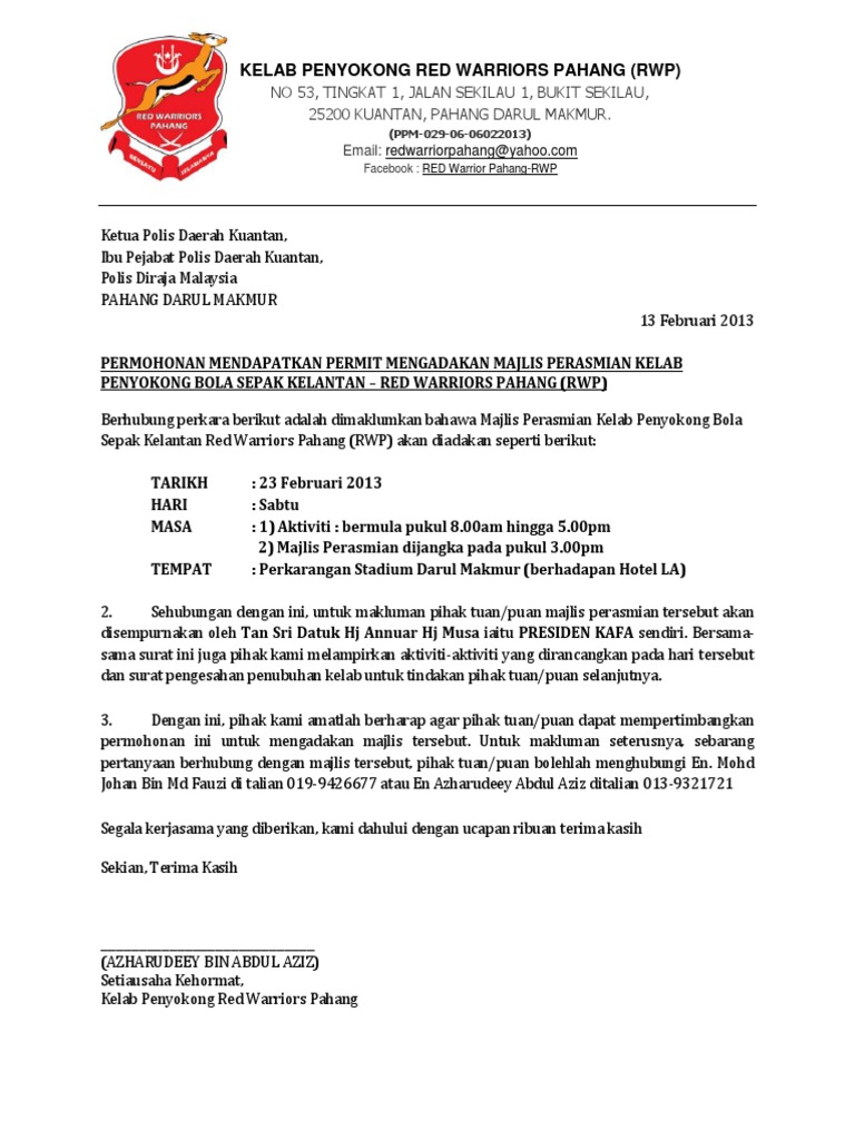 209126553 surat mohon permit polis docx. Contoh surat jemputan perasmian. Contoh surat rasmi mohon kerjasama jabatan kerajaan.